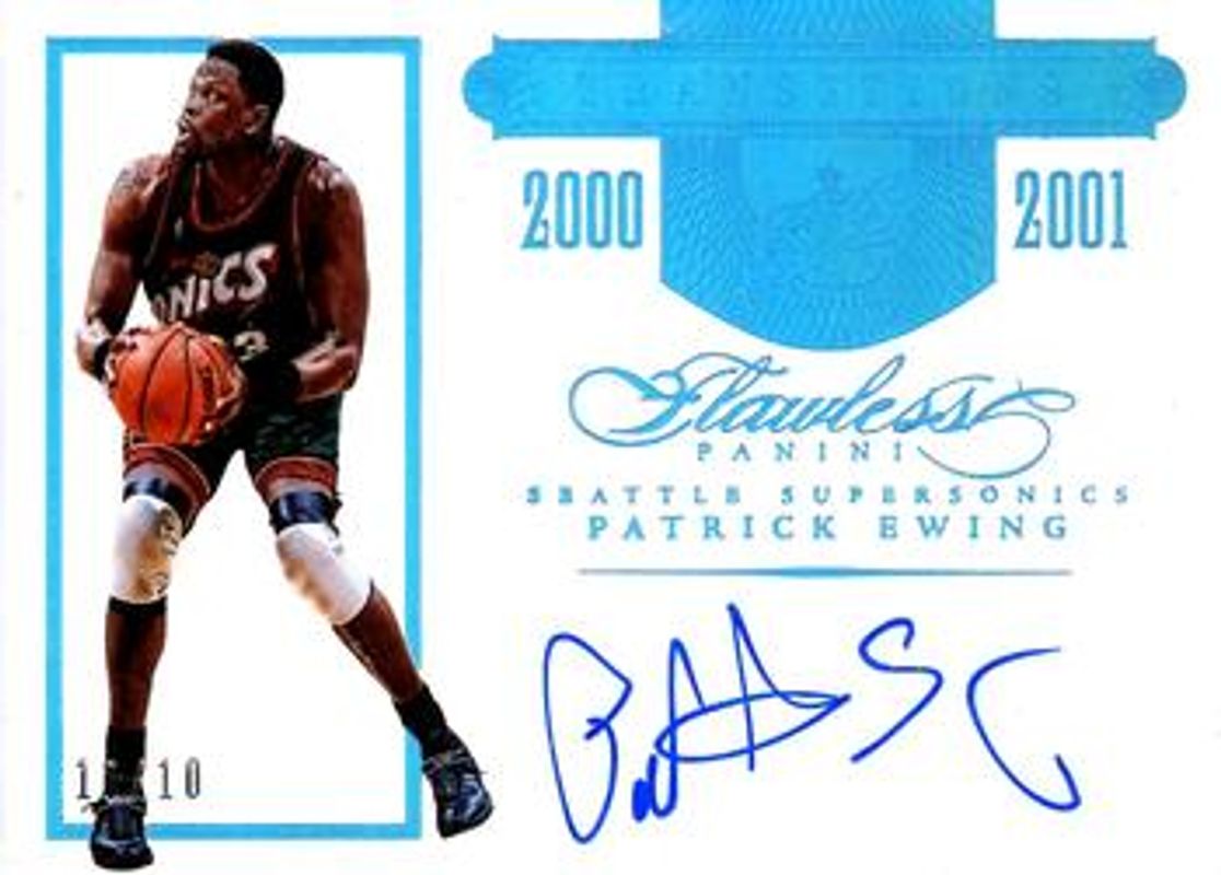 The Patrick Ewing 2015 Flawless #TR-PE3 Transitions - Sapphire /10 card is 1 of 28 Patrick Ewing's card variations in the 2015 Flawless set being tracked by Sports Card Investor, including Base /20, Ruby /15, Sapphire /10, Emerald /5, and Platinum /1.
