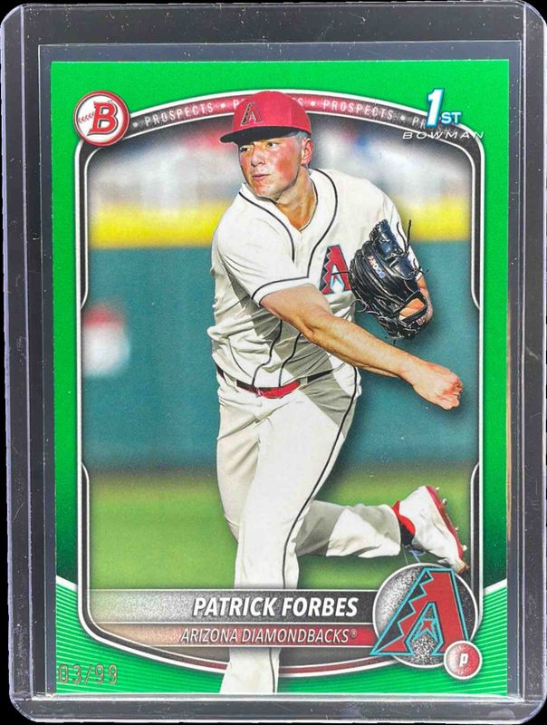 The Patrick Forbes 2025 Bowman Draft #BD-89 Green Border /99 card is 1 of 86 Patrick Forbes' card variations in the 2025 Bowman Draft set being tracked by Sports Card Investor, including Base, Chrome (1st), Chrome - Lazer Refractor (1st), Chrome - Refractor (1st), and Chrome - Sky Blue Refractor (1st).
