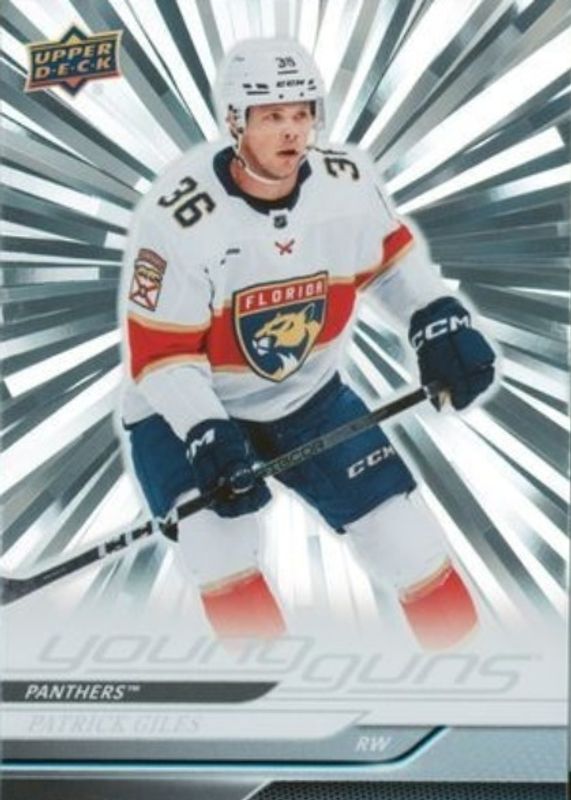 This card is 1 of 8 Patrick Giles' card variations in the 2024 Upper Deck set being tracked by Sports Card Investor, including Young Guns Base, Young Guns - Clear Cut, Young Guns - Deluxe /250, Young Guns - UD Exclusives /100, and Young Guns - Outburst Red /25.