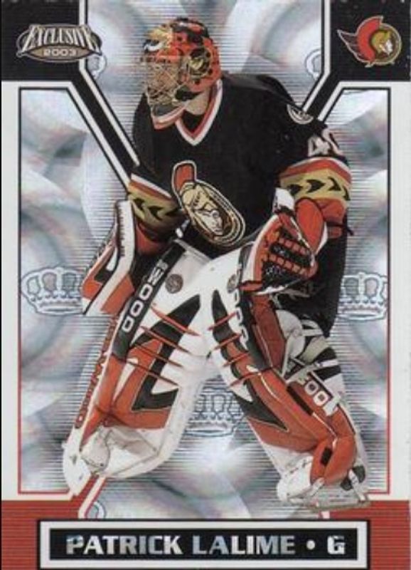 The Patrick Lalime 2002 Pacific Exclusive #123 Base /1000 card is 1 of 2 Patrick Lalime's card variations in the 2002 Pacific Exclusive set being tracked by Sports Card Investor, including Gold.