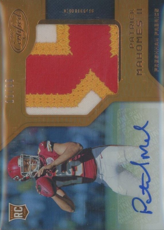 The Patrick Mahomes II 2017 Certified #207 Freshman Fabric Signatures - Mirror Orange (/99) Rookie card in Raw condition has not changed in price in the last 30 days and was last sold for $3,001.00 .