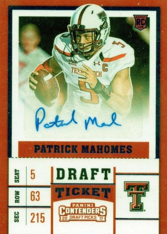 The Patrick Mahomes II 2017 Contenders Draft Picks #298 College Ticket Auto - Blue Foil Rookie card in Raw condition has not changed in price in the last 30 days and was last sold for $2,000.00 .