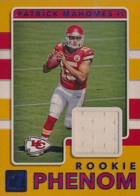 The Patrick Mahomes II 2017 Donruss #7 Rookie Phenom Jerseys - Blue card in Raw condition has not changed in price in the last 30 days and was last sold for $147.50 .