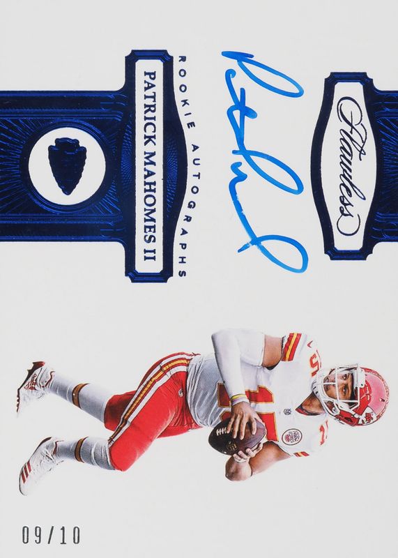 The Patrick Mahomes II 2017 Flawless #RA-PM Rookie Autographs - Sapphire (/10) card in Raw condition has not changed in price in the last 30 days and was last sold for $11,100.00 .