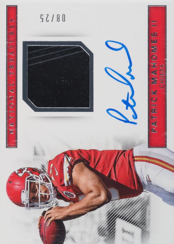 The Patrick Mahomes II 2017 National Treasures #RG-2PM Rookie Gloves Signatures /25 card in Raw condition has not changed in price in the last 30 days and was last sold for $2,802.00 .