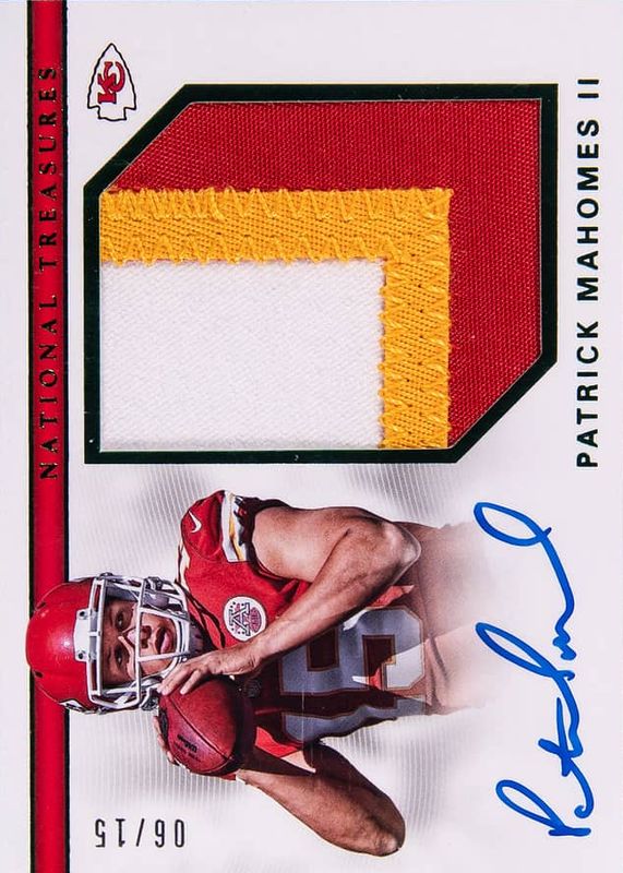 This card is 1 of 57 Patrick Mahomes II's card variations in the 2017 National Treasures set being tracked by Sports Card Investor, including Rookie NFL Gear Signature Combos (/99), Rookie NFL Gear Signature Trios (/99), Rookie Patch Auto - Green Jersey Number (/15), Rookie Colossal Signatures /99, and Rookie Material Signatures /99.
