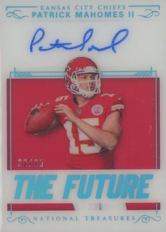 The Patrick Mahomes II 2017 National Treasures #F-2PM The Future Signatures /25 Rookie card in Raw condition has not changed in price in the last 30 days and was last sold for $7,500.00 .