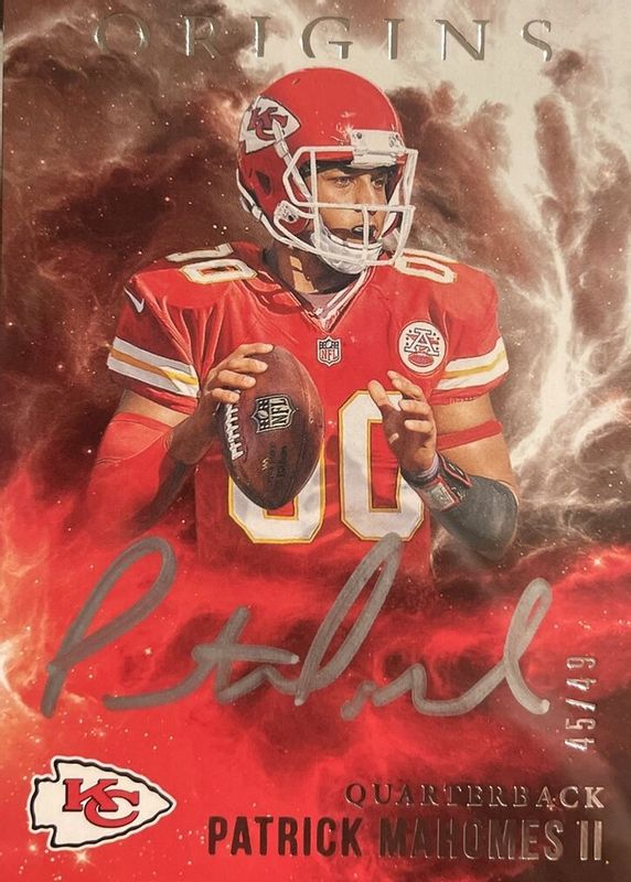 This card is 1 of 19 Patrick Mahomes II's card variations in the 2017 Origins set being tracked by Sports Card Investor, including Rookie Autographs, Rookie Autographs - Blue (/25), Rookie Autographs - Gold (/5), Rookie Autographs - Green (/3), and Rookie Autographs - Red (/49).