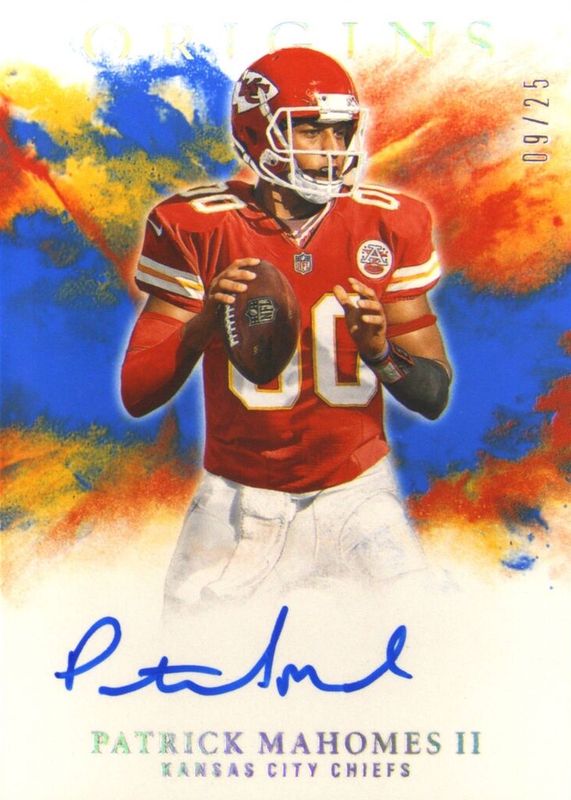 This card is 1 of 19 Patrick Mahomes II's card variations in the 2017 Origins set being tracked by Sports Card Investor, including Origins Rookie Autographs - Silver Ink (/49), Rookie Autographs, Rookie Autographs - Gold (/5), Rookie Autographs - Green (/3), and Rookie Autographs - Red (/49).