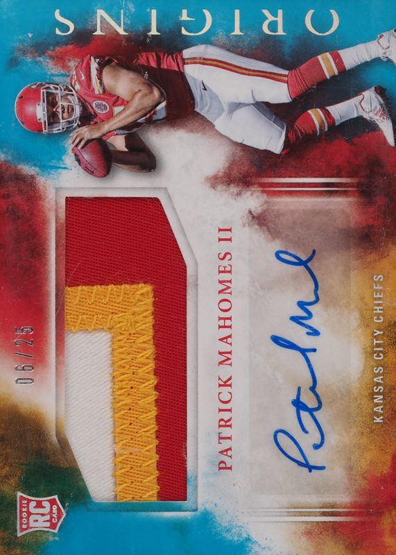 The Patrick Mahomes II 2017 Origins #104 Rookie Jumbo Patch Autographs - Turquoise /25 card in Raw condition has not changed in price in the last 30 days and was last sold for $1,600.00 .