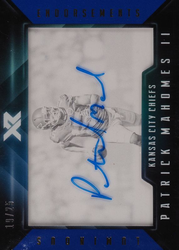 The Patrick Mahomes II 2017 XR #LE-PM Luminous Endorsements Autographs - Blue (/25) Rookie card in Raw condition has not changed in price in the last 30 days and was last sold for $915.00 .
