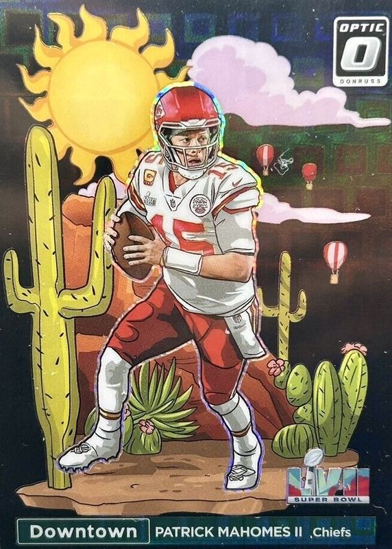 The Patrick Mahomes II 2023 Optic #SBD-PM Super Bowl Downtown - Black Pandora /25 card in Raw condition has not changed in price in the last 30 days and was last sold for $7,250.00 .