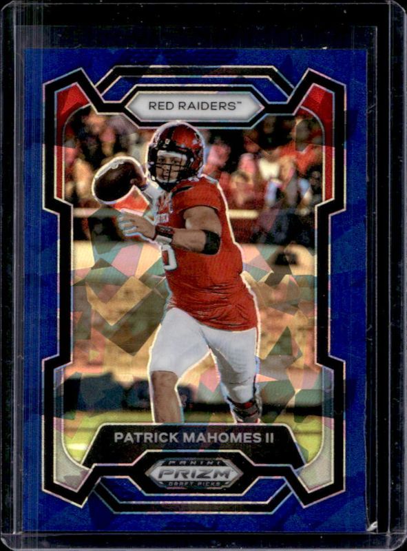 The Patrick Mahomes II 2024 Prizm Draft Picks #61 Blue Ice /99 card is 1 of 31 Patrick Mahomes II's card variations in the 2024 Prizm Draft Picks set being tracked by Sports Card Investor, including Base, Green, Purple Wave, Red Ice, and Ruby Wave.