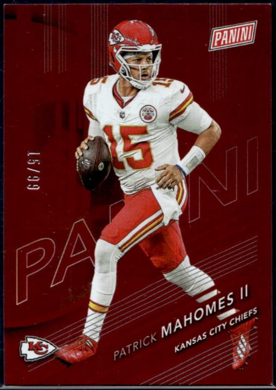 The Patrick Mahomes 2024 Panini NSCC Wrapper Redemption #1 Red /99 card is 1 of 14 Patrick Mahomes' card variations in the 2024 Panini NSCC Wrapper Redemption set being tracked by Sports Card Investor, including Base, Foil, Orange /199, Blue /50, and Cracked Ice /25.