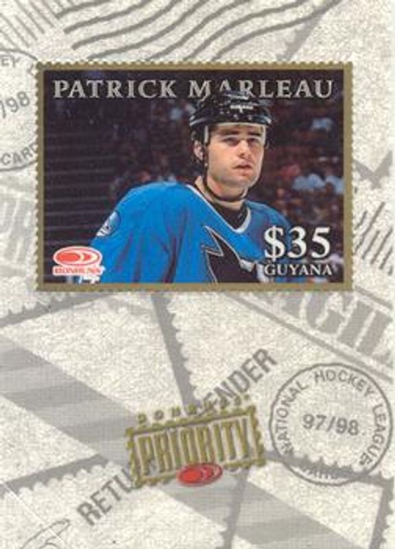 The Patrick Marleau 1997 Donruss Priority Stamps Gold card is 1 of 14 Patrick Marleau's card variations in the 1997 Donruss Priority set being tracked by Sports Card Investor, including #175 Base, #195 Base, #216 Base, #18 Direct Deposit Promos, and #216 Stamp of Approval /100.