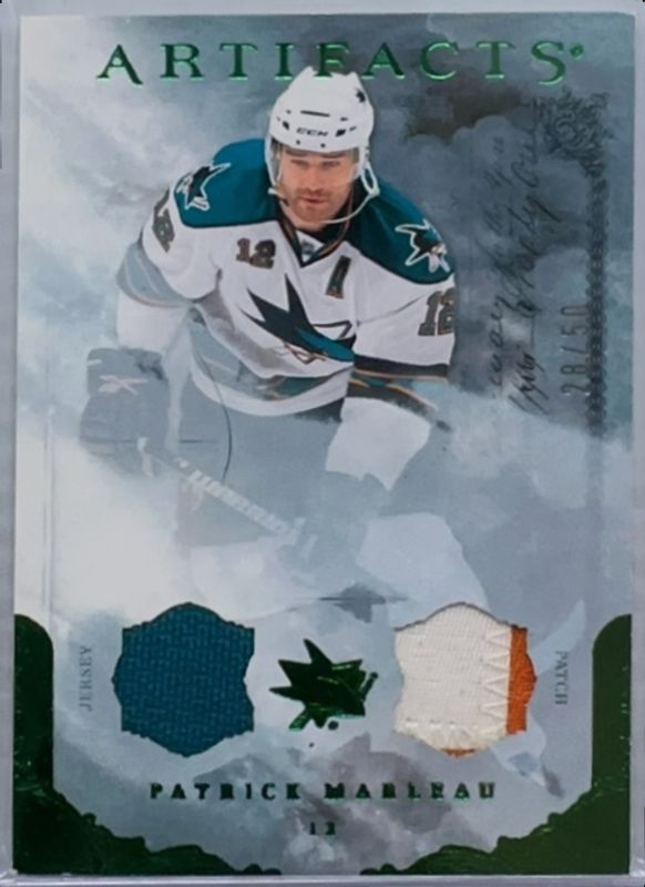 The Patrick Marleau 2010 Upper Deck Artifacts #21 Jerseys Patches - Emerald /50 card is 1 of 21 Patrick Marleau's card variations in the 2010 Upper Deck Artifacts set being tracked by Sports Card Investor, including Base /699, Emerald /50, Gold /35, Silver /25, and Rainbow /10.