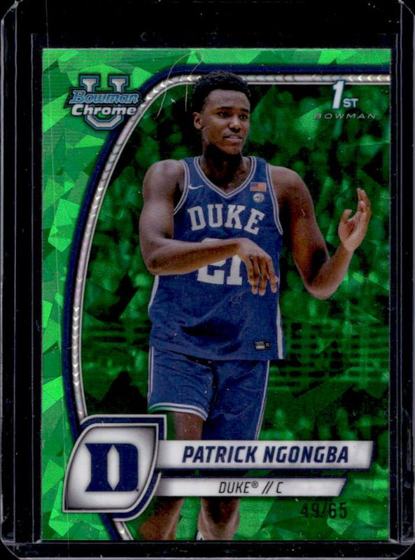 The Patrick Ngongba 2024 Bowman Chrome University Sapphire Edition #58 Green Refractor /65 card is 1 of 18 Patrick Ngongba's card variations in the 2024 Bowman Chrome University Sapphire Edition set being tracked by Sports Card Investor, including Base, Purple Refractor /100, Yellow Refractor /75, Gold Refractor /50, and Orange Refractor /25.