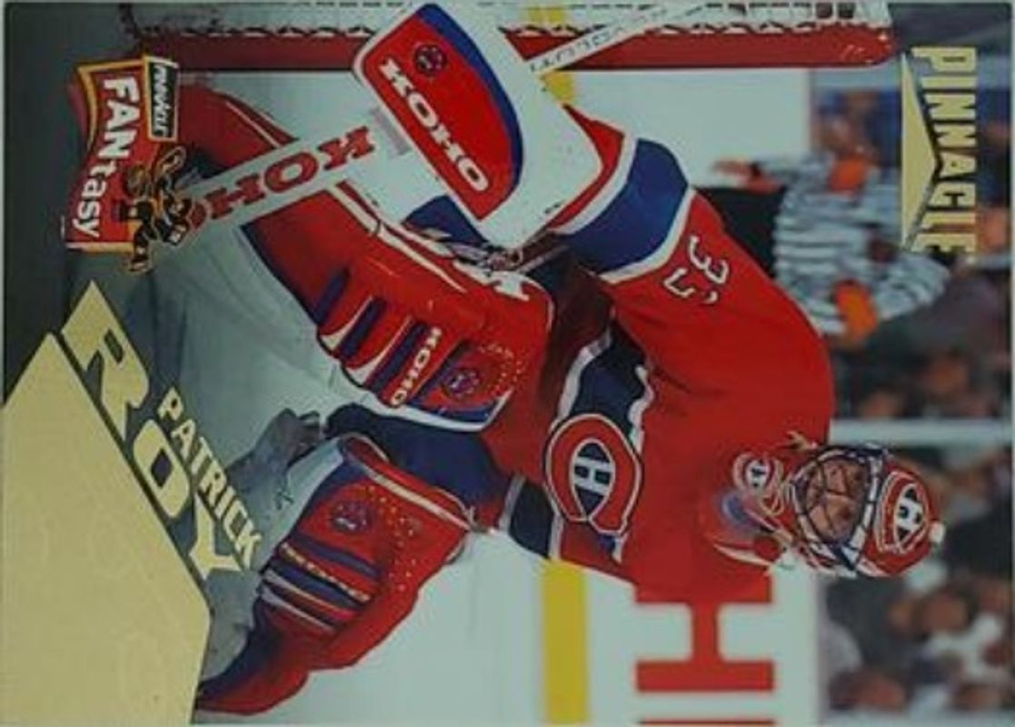 The Patrick Roy 1995 Pinnacle #10 FANtasy card is 1 of 6 Patrick Roy's card variations in the 1995 Pinnacle set being tracked by Sports Card Investor, including Base, Rink Collection, Rink Collection Artist's Proofs, Clear Shots, and First Strike.