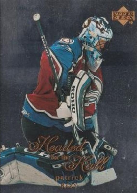 The Patrick Roy 1999 Upper Deck #HOF-10 Headed for the Hall card is 1 of 38 Patrick Roy's card variations in the 1999 Upper Deck set being tracked by Sports Card Investor, including #141 Base, #210 Base, #141 UD Exclusives /100, #210 UD Exclusives /100, and #141 UD Exclusives 1/1 /1.