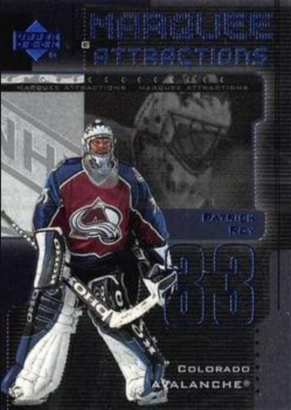 The Patrick Roy 1999 Upper Deck #MA6 Marquee Attractions card is 1 of 38 Patrick Roy's card variations in the 1999 Upper Deck set being tracked by Sports Card Investor, including #141 Base, #210 Base, #141 UD Exclusives /100, #210 UD Exclusives /100, and #141 UD Exclusives 1/1 /1.