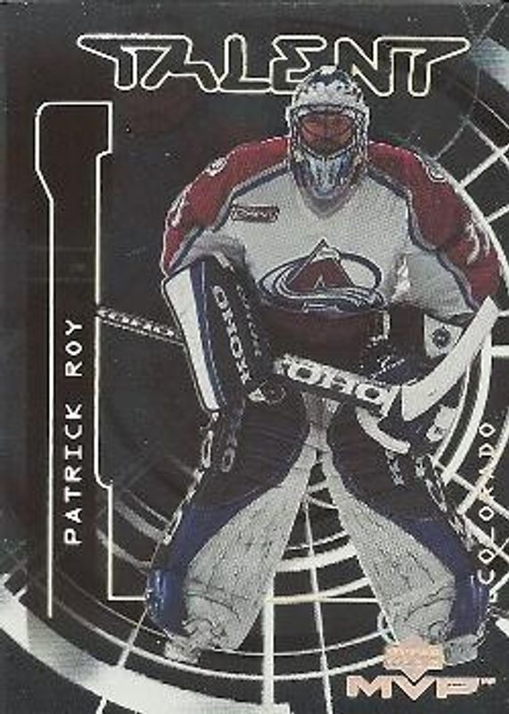 The Patrick Roy 2000 Upper Deck MVP #M5 MVP Talent card is 1 of 9 Patrick Roy's card variations in the 2000 Upper Deck MVP set being tracked by Sports Card Investor, including Base, Third Star, Second Star /100, First Star /25, and Game Used Souvenirs.