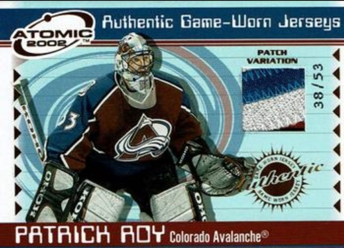 The Patrick Roy 2001 Pacific Atomic #13 Patches /403 card is 1 of 10 Patrick Roy's card variations in the 2001 Pacific Atomic set being tracked by Sports Card Investor, including Base /500, Red /290, Gold /200, Premiere Date /90, and Blue /9.