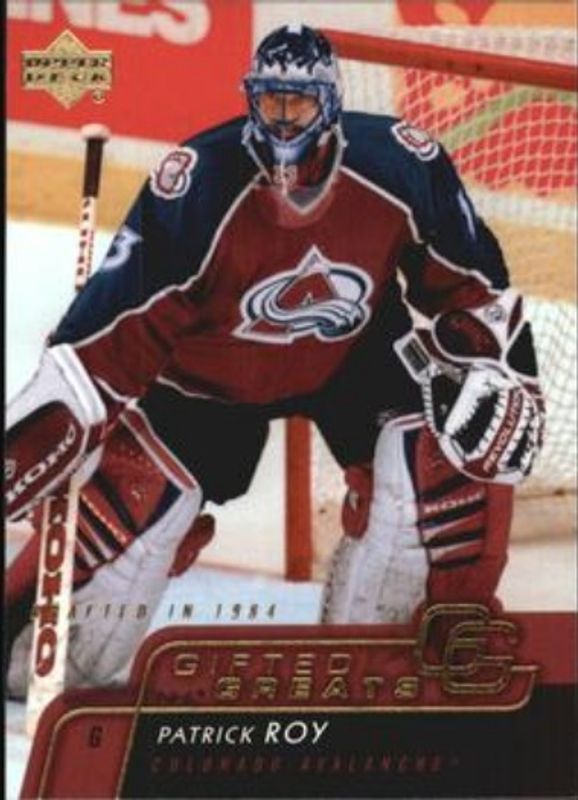 The Patrick Roy 2002 Upper Deck #GG4 Gifted Greats card is 1 of 20 Patrick Roy's card variations in the 2002 Upper Deck set being tracked by Sports Card Investor, including #185 Base, #43 Base, #179 Base, #185 UD Exclusives /75, and #179 UD Exclusives /75.