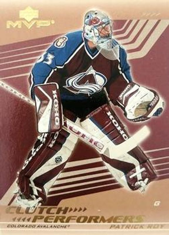 The Patrick Roy 2003 Upper Deck MVP #CP1 Clutch Performers card is 1 of 8 Patrick Roy's card variations in the 2003 Upper Deck MVP set being tracked by Sports Card Investor, including Base, Silver Script /150, Gold Script /25, Red Script /25, and Masked Men.
