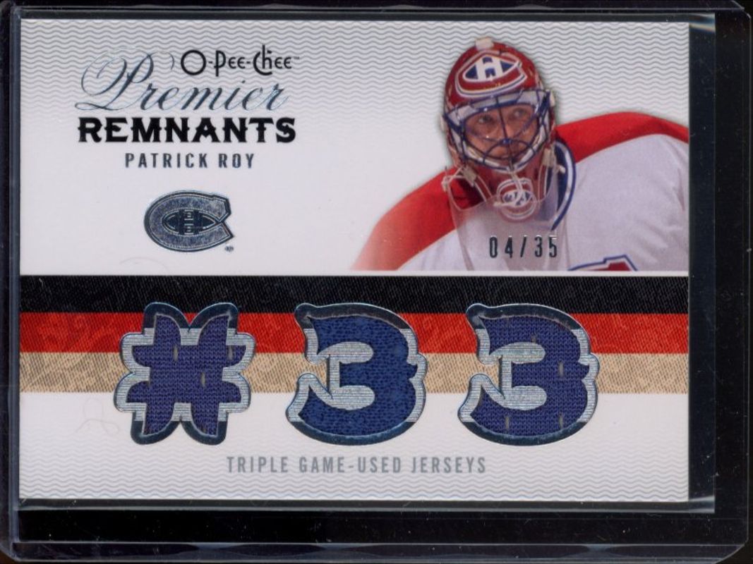 The Patrick Roy 2009 O-Pee-Chee Premier #PRT-PR Rare Remnants Triples /35 card is 1 of 16 Patrick Roy's card variations in the 2009 O-Pee-Chee Premier set being tracked by Sports Card Investor, including Base /299, Gold /25, Black /10, Gold Spectrum /10, and Gold Spectrum Autographs /1.