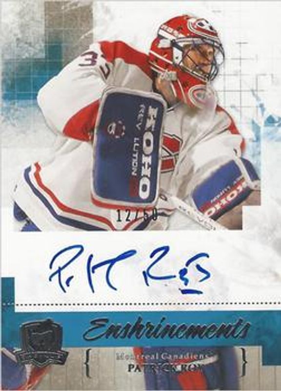 The Patrick Roy 2010 Upper Deck The Cup #CE-PR Enshrinements /50 card is 1 of 21 Patrick Roy's card variations in the 2010 Upper Deck The Cup set being tracked by Sports Card Investor, including Base /199, Artist Proof Stanley Cup Signatures, Gold /25, Gold Rainbow /25, and Black /1.
