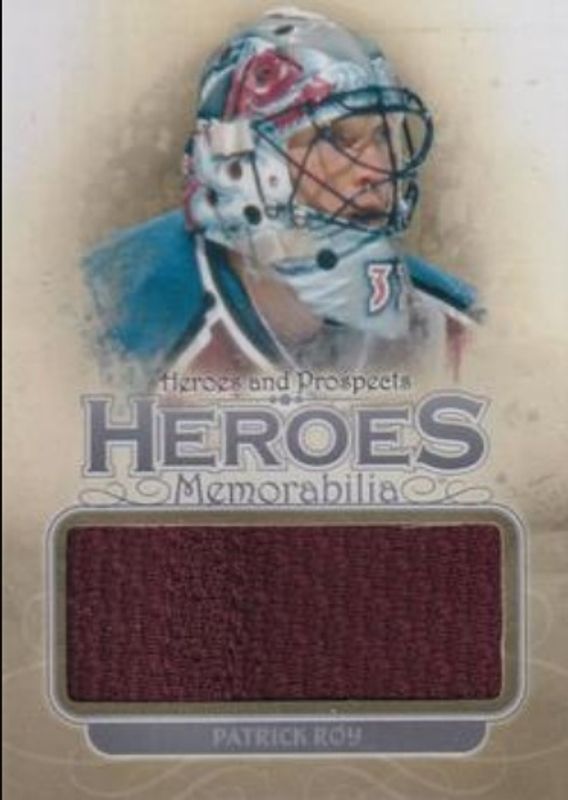 The Patrick Roy 2012 In The Game Heroes & Prospects #HM-02 Heroes Memorabilia card is 1 of 3 Patrick Roy's card variations in the 2012 In The Game Heroes & Prospects set being tracked by Sports Card Investor, including Base, and Heroes Memorabilia Gold.