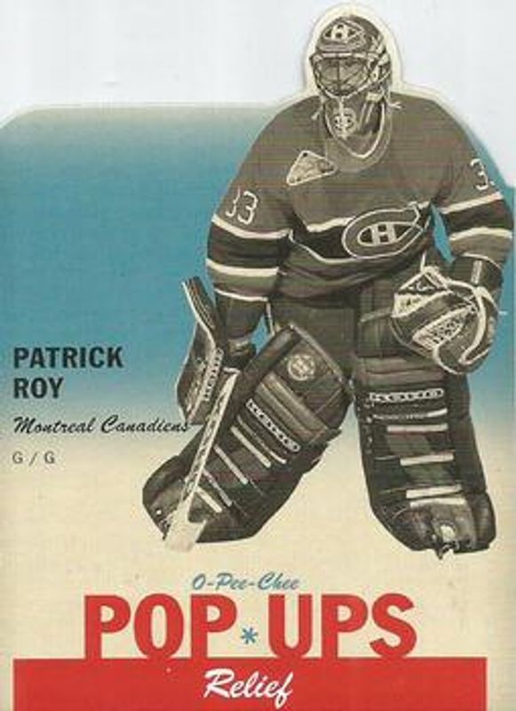 The Patrick Roy 2012 O-Pee-Chee #PU-28 Pop Ups card is 1 of 11 Patrick Roy's card variations in the 2012 O-Pee-Chee set being tracked by Sports Card Investor, including Base, Rainbow, Retro, Retro Blank Back, and Black Rainbow /100.
