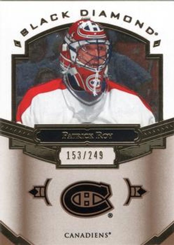 The Patrick Roy 2016 Upper Deck Black Diamond #BDB-PR Base /249 card is 1 of 10 Patrick Roy's card variations in the 2016 Upper Deck Black Diamond set being tracked by Sports Card Investor, including Relics /149, Pure Black Signatures /99, Pure Black Prime Relics /50, Championship Banners Manufactured Patch /112, and Championship Banners Manufactured Patch Gold Autographs /99.