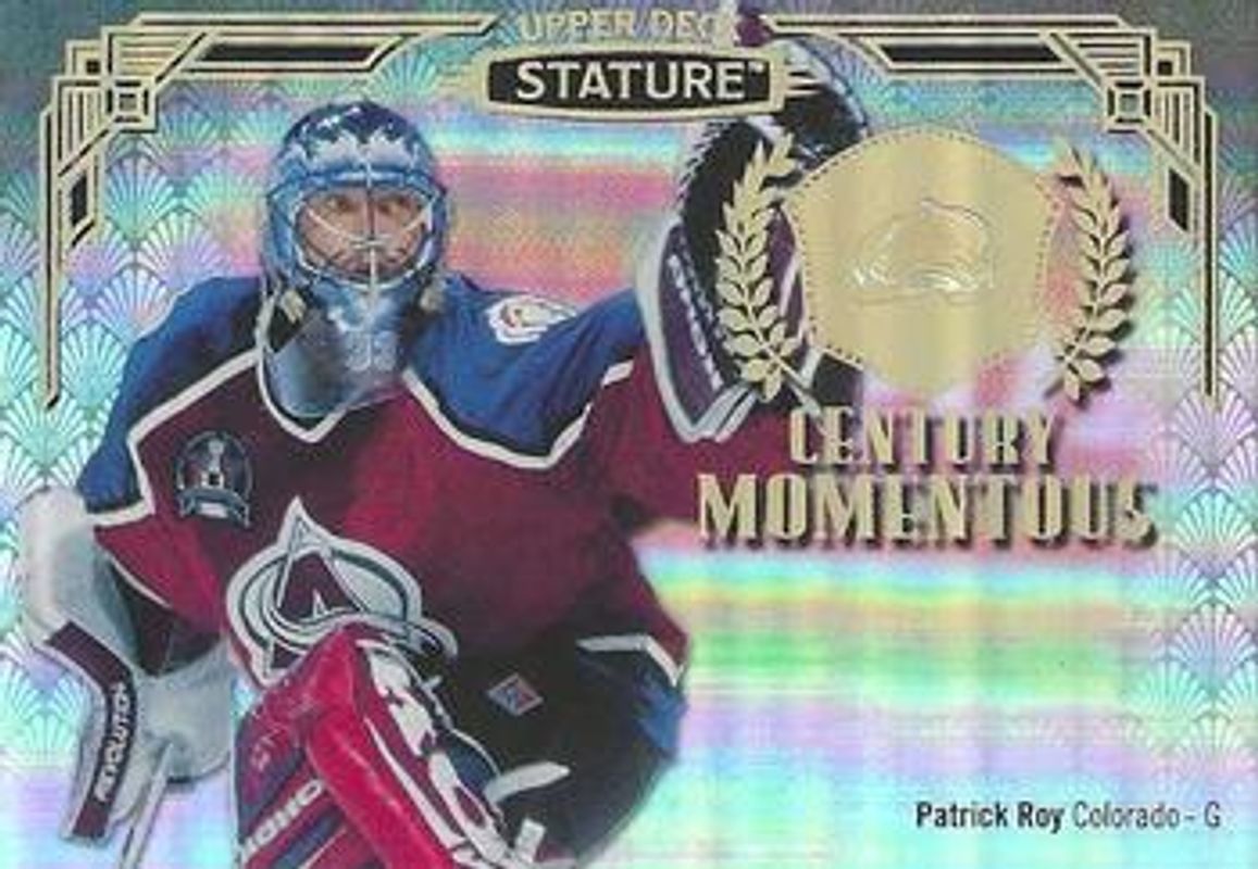 The Patrick Roy 2020 Upper Deck Stature #CM-13 Century Momentous card is 1 of 26 Patrick Roy's card variations in the 2020 Upper Deck Stature set being tracked by Sports Card Investor, including Base /399, Autographs /199, Green /175, Portrait /99, and Autographs Green /85.