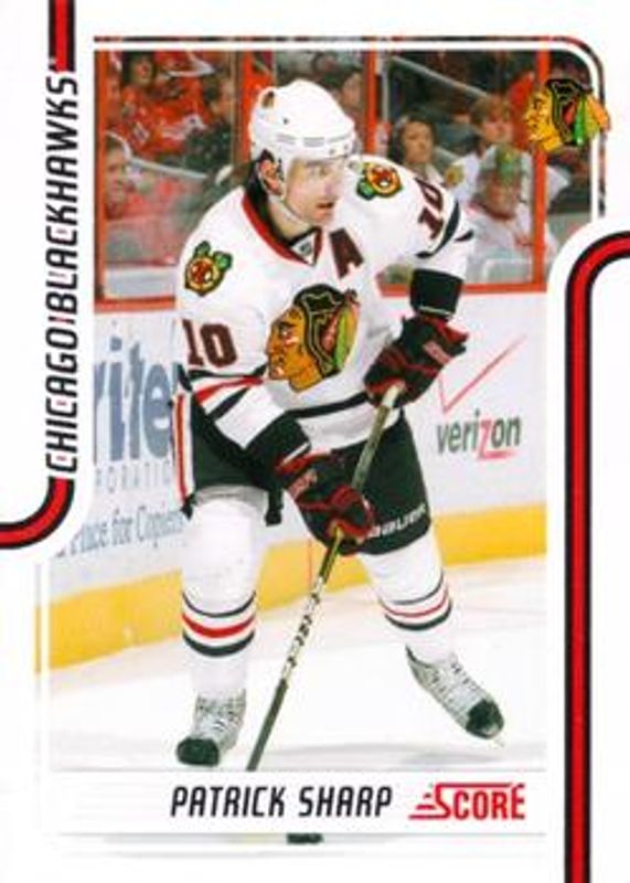 The Patrick Sharp 2011 Score #116 Base card is 1 of 6 Patrick Sharp's card variations in the 2011 Score set being tracked by Sports Card Investor, including Black Ice, Glossy, Gold Rush, Score Signatures, and Snow Globe Die Cuts.