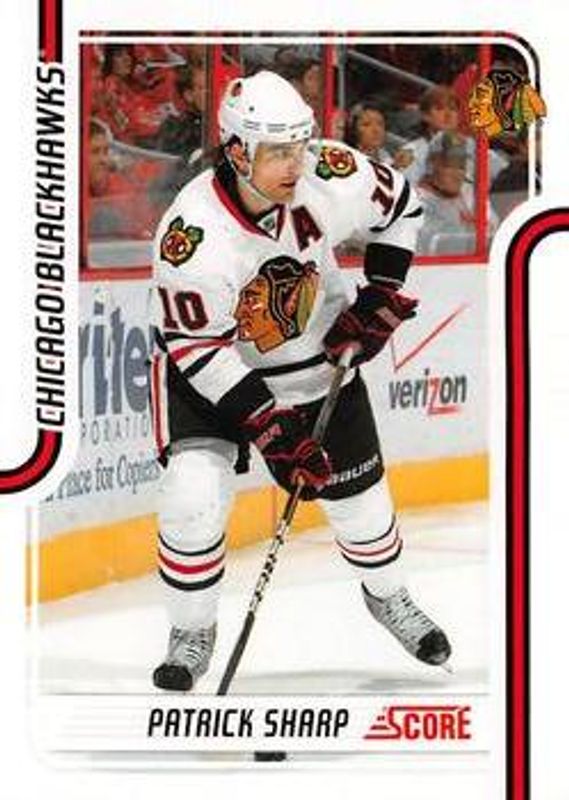 The Patrick Sharp 2011 Score #116 Glossy card is 1 of 6 Patrick Sharp's card variations in the 2011 Score set being tracked by Sports Card Investor, including Base, Black Ice, Gold Rush, Score Signatures, and Snow Globe Die Cuts.