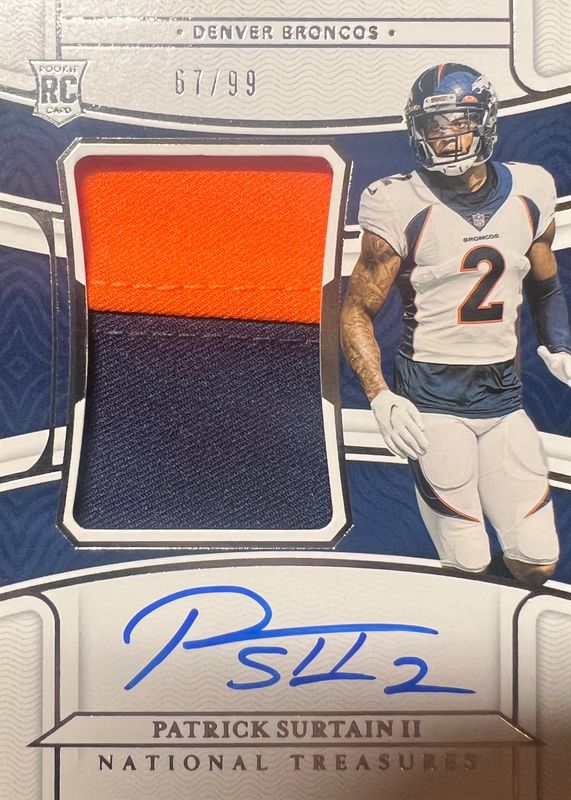 The Patrick Surtain II 2021 National Treasures #199 Rookie Patch Auto /99 card in Raw condition has not changed in price in the last 30 days and was last sold for $135.00 .