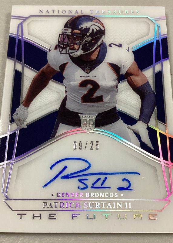 The Patrick Surtain II 2021 National Treasures #TF-PS The Future Autographs - Holo Silver /25 Rookie card in Raw condition has not changed in price in the last 30 days and was last sold for $129.99 .