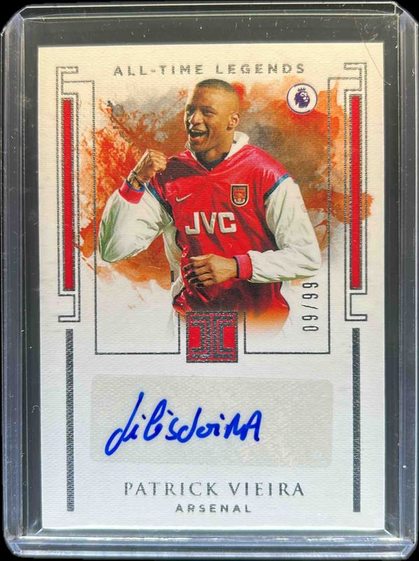 The Patrick Vieira 2019 Impeccable Premier League #AT-PV All Time Legends /75 card is 1 of 9 Patrick Vieira's card variations in the 2019 Impeccable Premier League set being tracked by Sports Card Investor, including Immortal Ink /99, All Time Legends - Silver /25, Immortal Ink - Silver /25, All Time Legends - Gold /10, and Immortal Ink - Gold /10.