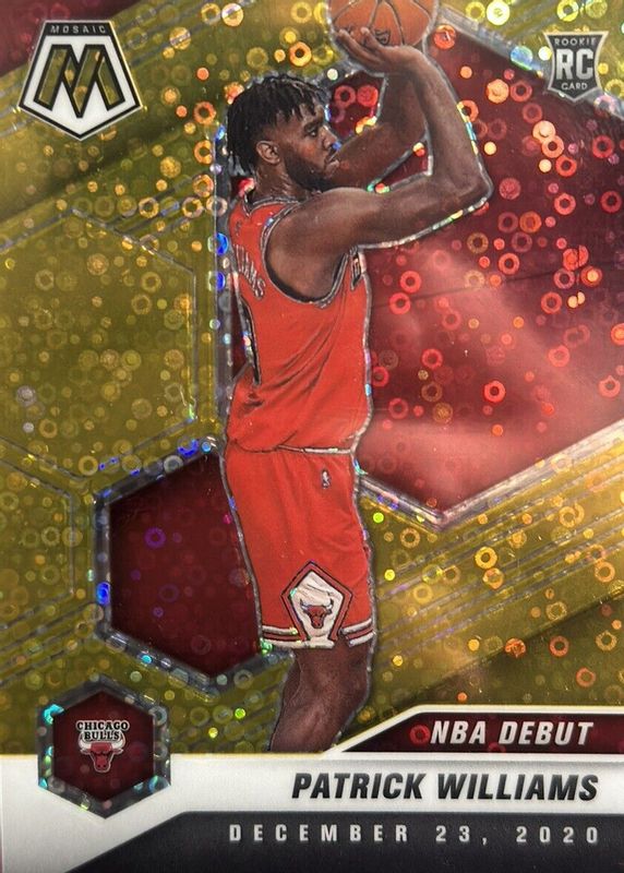 The Patrick Williams 2020 Mosaic #267 NBA Debut - Fast Break Gold /10 Rookie card in Raw condition has not changed in price in the last 30 days and was last sold for $71.00 .