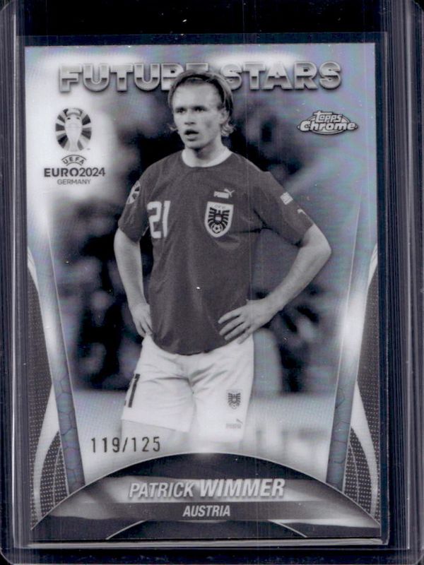 The Patrick Wimmer 2023 Topps Chrome UEFA Euro #36 Black & White Refractor /125 card is 1 of 16 Patrick Wimmer's card variations in the 2023 Topps Chrome UEFA Euro set being tracked by Sports Card Investor, including Base, Green Ray Wave Refractor, Refractor, Aqua Wave Refractor /199, and Purple Lava Refractor /175.