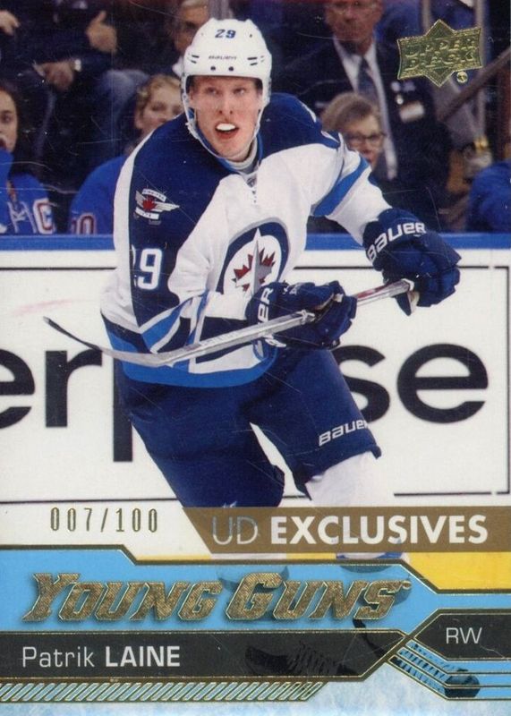 The Patrik Laine 2016 Upper Deck #451 Young Guns - UD Exclusives /100 Rookie card in Raw condition has not changed in price in the last 30 days and was last sold for $134.40 .