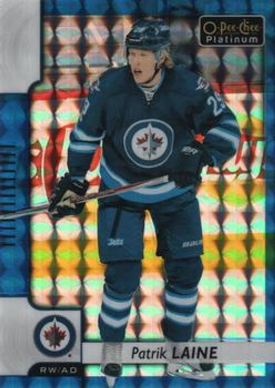 The Patrik Laine 2017 O-Pee-Chee Platinum #8 Royal Blue Cubes /99 card is 1 of 18 Patrik Laine's card variations in the 2017 O-Pee-Chee Platinum set being tracked by Sports Card Investor, including Base, Rainbow, Violet Pixels, Red Prism /199, and Seismic Gold /50.
