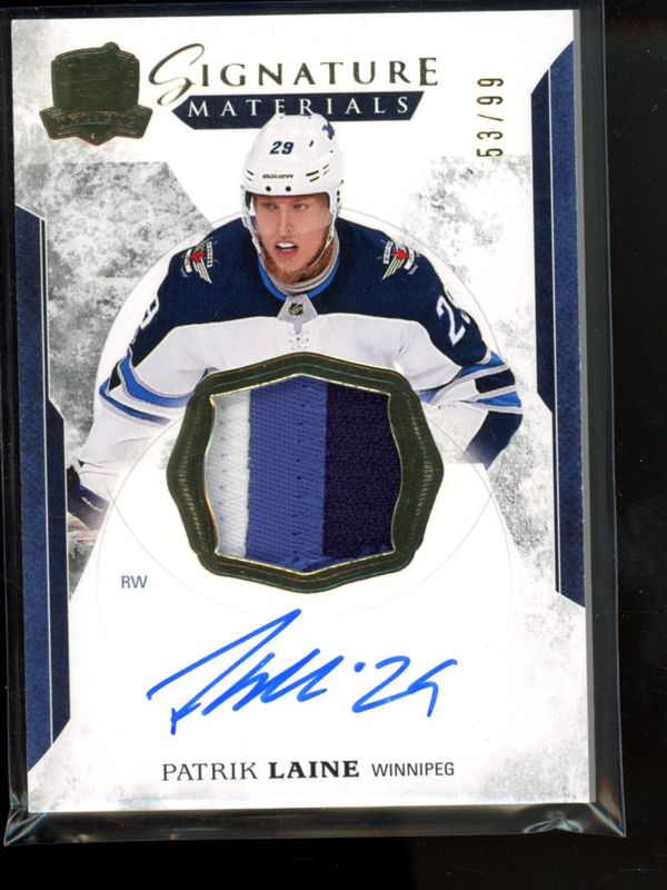 The Patrik Laine 2017 Upper Deck The Cup #SP-PL Signatures Patches /99 card is 1 of 30 Patrik Laine's card variations in the 2017 Upper Deck The Cup set being tracked by Sports Card Investor, including Base /249, Gold Spectrum Foil /36, Gold Foil Patch /24, Red Foil Tag /8, and Green Foil Button /3.