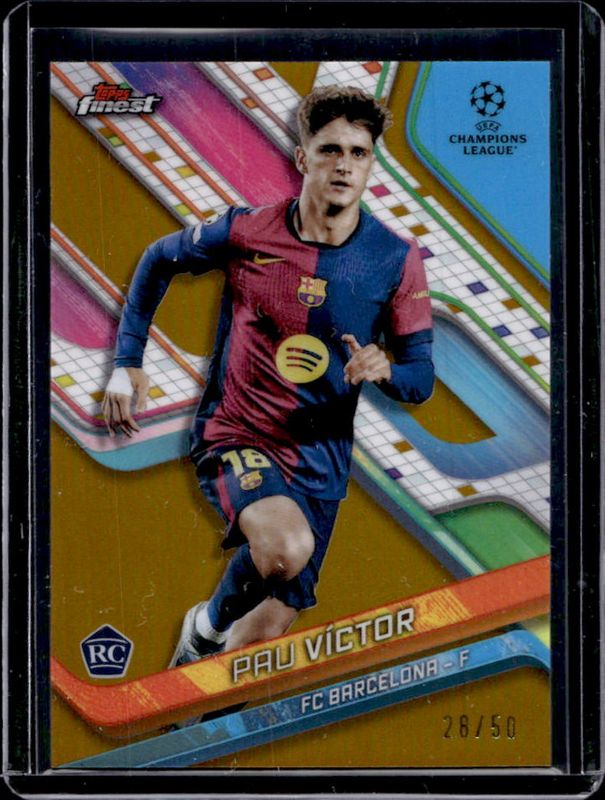 The Pau Victor 2024 Topps Finest UEFA Club Competitions #87 Gold Refractor /50 card is 1 of 42 Pau Victor's card variations in the 2024 Topps Finest UEFA Club Competitions set being tracked by Sports Card Investor, including Base, Refractor, Purple Refractor /299, Sky Blue Refractor /275, and Pink RayWave Refractor /250.