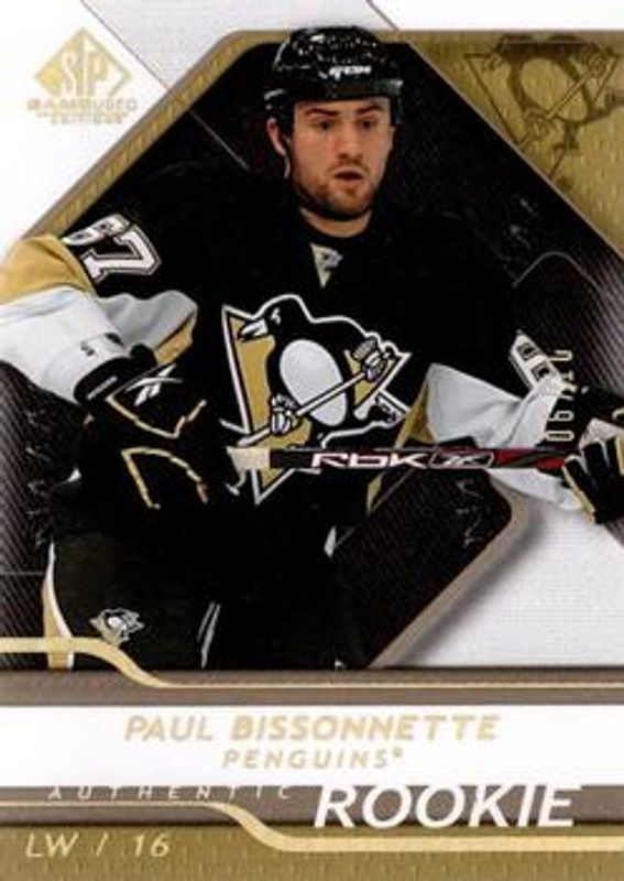 The Paul Bissonnette 2008 SP Game Used #167 Gold Spectrum /10 Rookie card is 1 of 5 Paul Bissonnette's card variations in the 2008 SP Game Used set being tracked by Sports Card Investor, including Base /999, Gold /100, Platinum /25, and Platinum Spectrum /1.