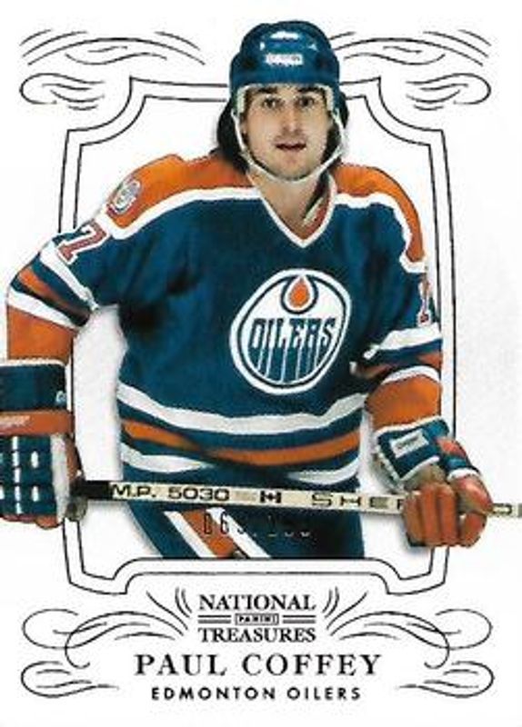 The Paul Coffey 2013 National Treasures #7 Base /99 card is 1 of 29 Paul Coffey's card variations in the 2013 National Treasures set being tracked by Sports Card Investor, including Gold /25, Silver /25, Emerald /5, Black /1, and Printing Plates Black /1.