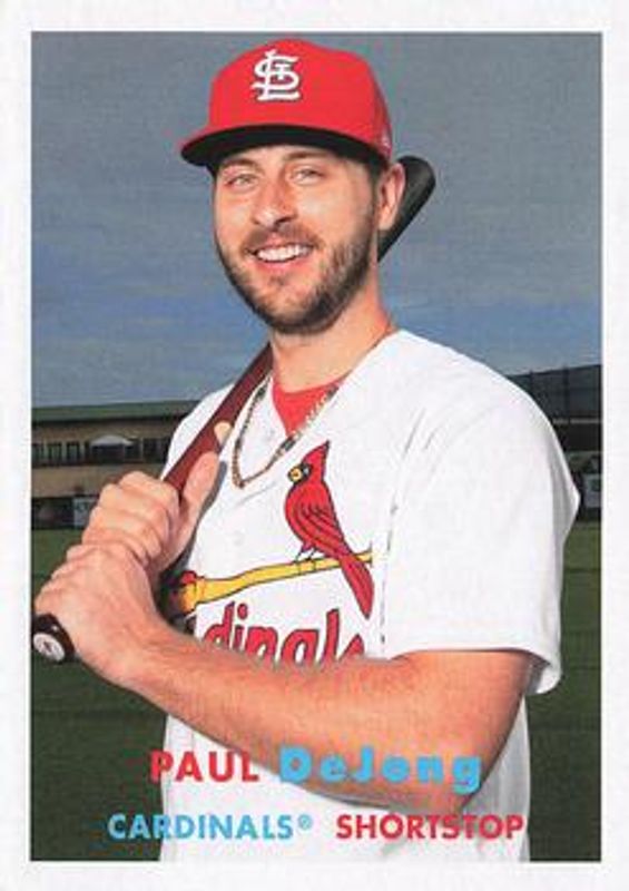 The Paul DeJong 2021 Topps Archives #34 Base card is 1 of 15 Paul DeJong's card variations in the 2021 Topps Archives set being tracked by Sports Card Investor, including Rainbow Foil /150, Green /125, Silver /99, Red /75, and Red Hot Foil /50.
