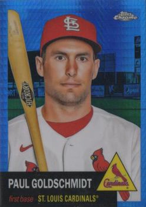 The Paul Goldschmidt 2022 Topps Chrome Platinum Anniversary #229 Blue Prism Refractor card is 1 of 45 Paul Goldschmidt's card variations in the 2022 Topps Chrome Platinum Anniversary set being tracked by Sports Card Investor, including Base, Black & White Mini Diamond Refractor, Gold Prism Refractor, Prism Refractor, and Red Prism Refractor.