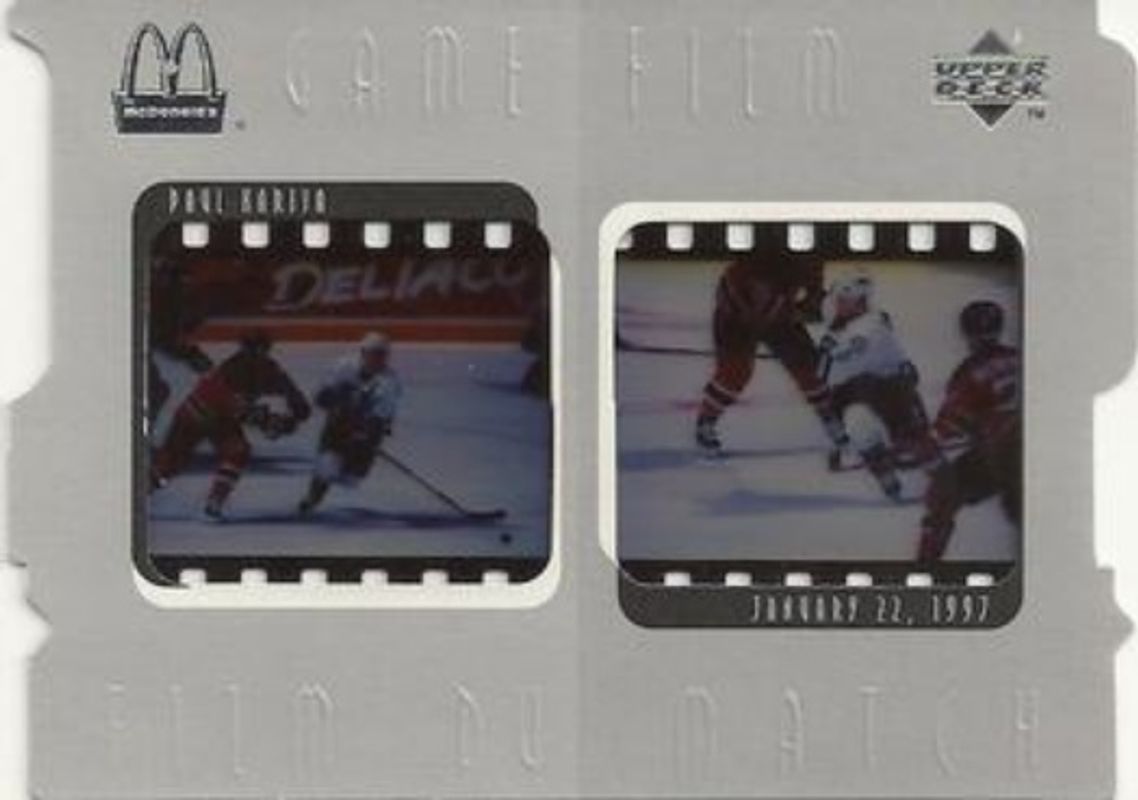 The Paul Kariya 1997 Upper Deck Ice McDonald's #F6 Game Film card is 1 of 2 Paul Kariya's card variations in the 1997 Upper Deck Ice McDonald's set being tracked by Sports Card Investor, including Base.
